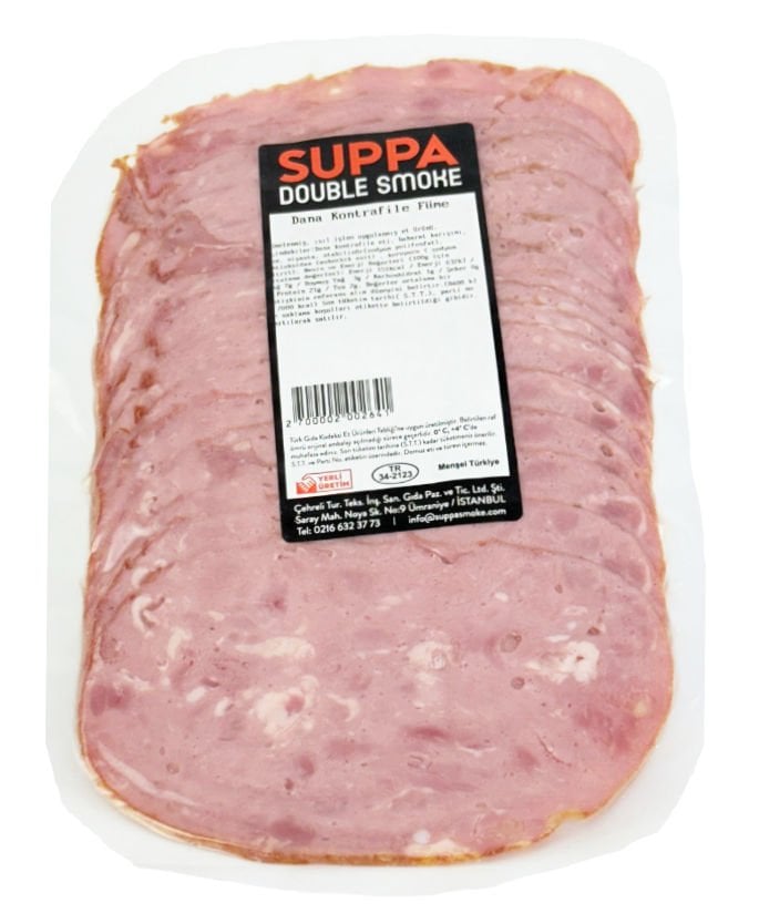 Suppa Double Smoke Dilimli Dana Kontrafile Füme 250 Gr, özenle seçilmiş dana kontrafile etinin fümelenerek ince dilimler halinde sunulduğu özel bir lezzet. Sandviç, kahvaltı ve gurme tarifler için ideal bir seçimdir. Yumuşak dokusu ve zengin aromasıyla sofralarınıza kalite katar.